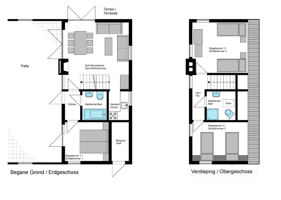 The freestanding holiday home has two own parking spaces directly in front of the house. The house itself offers beside a cozy courtyard (closed) a large garden with 6 garden chairs and a spacious table. The house has three bedrooms, two bathrooms (one with bathtub), a well equipped kitchen with dishwasher and microwave, as well as the cozy living / dining room with an open fireplace. Of course, Wifi is available in the house and garden free of charge!